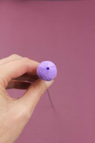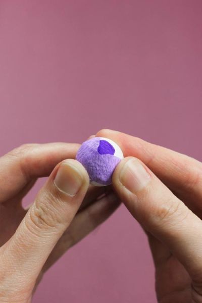 Em seguida, cole um círculo de papel crepom no meio da bolinha de isopor, na parte de cima.