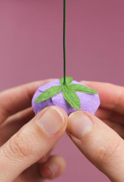 Em seguida, cole uma tira de papel crepom verde desde a base da flor até a ponta, colando no início e no final.